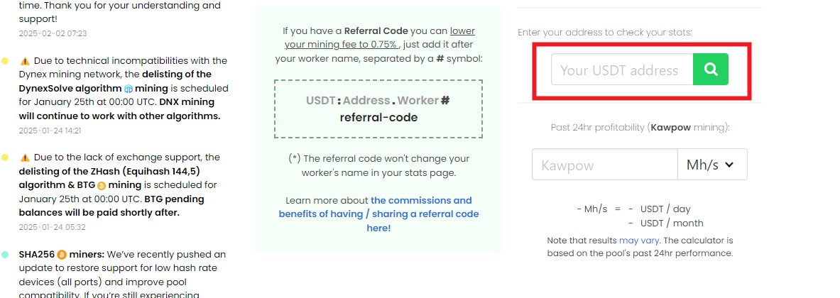 网站首页往下拉,右下角“Enter your address to check your stats:”这里输入你自己的钱包地址,点搜索就可以了。下图标记红色的位置